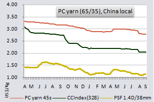 In Qianqing, PC (65/35) 32s yarn prices were up US cent 1 a kg and 21s were also up US cent 1 a kg in the last week of September.