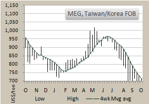 European MEG contract price for October was fully settled and was down Euro26 a ton from September numbers.