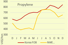 Propylene prices in Asian markets rose in December as downstream PP makers strengthened while Chinese ports saw congestion.