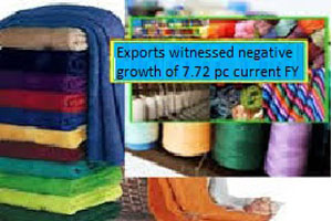Pakistan’s textile exports during the first ten months (July-April) 2015-16 of the current fiscal witnessed the negative growth of 7.72 percent at $10.395 billion compared to $11.265 billion in last financial year, said Minister for Commerce Khurram Dastigir Khan on Wednesday.