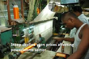 Cotton price that stood at Rs 52,000 a bale (172 kg) some months back has started declining slowly which is now available at Rs 46,000 to Rs 48,000 a bale. A steep decline in yarn prices is affecting the powerloom sector. About 2,000 of the about 10,000 power looms in Erode and surrounding areas closed down in the last three days, with the danger of many more following suit, according to a senior official of Erode Powerloom Owners Association.