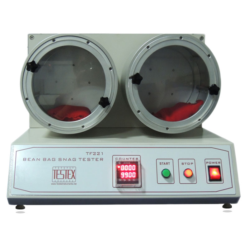 Bean Bag Snag Tester, to determine the snagging and picking resistance of knitted and woven fabrics by tumbling fabrics pillows containing a weighted bean bag within two separate test cylinders.